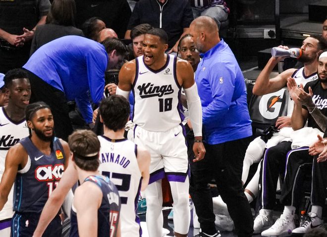 回顾一下比赛。开场霍姆格伦和华莱士就内外开花,威少助攻尤班克斯吃饼,亚历山大轻松上篮,霍姆格伦顶着德罗赞双手暴扣!威少断球亚历山大继续喂饼拉文,下回合又抢断霍姆格伦,在威少带领下,国王一路紧咬比分,而且威少连续给队友送出精妙传球。后半段亚历山大内外开花,施罗德单打回应,双方陷入拉锯战,第一节国王25-27雷霆。进入第二节,华莱士和施罗德继续对轰三分,霍姆格伦炸扣,阿丘瓦立刻点名霍姆格伦上篮回应。中段国王连续失误被打停,没办法,还是换上威少。